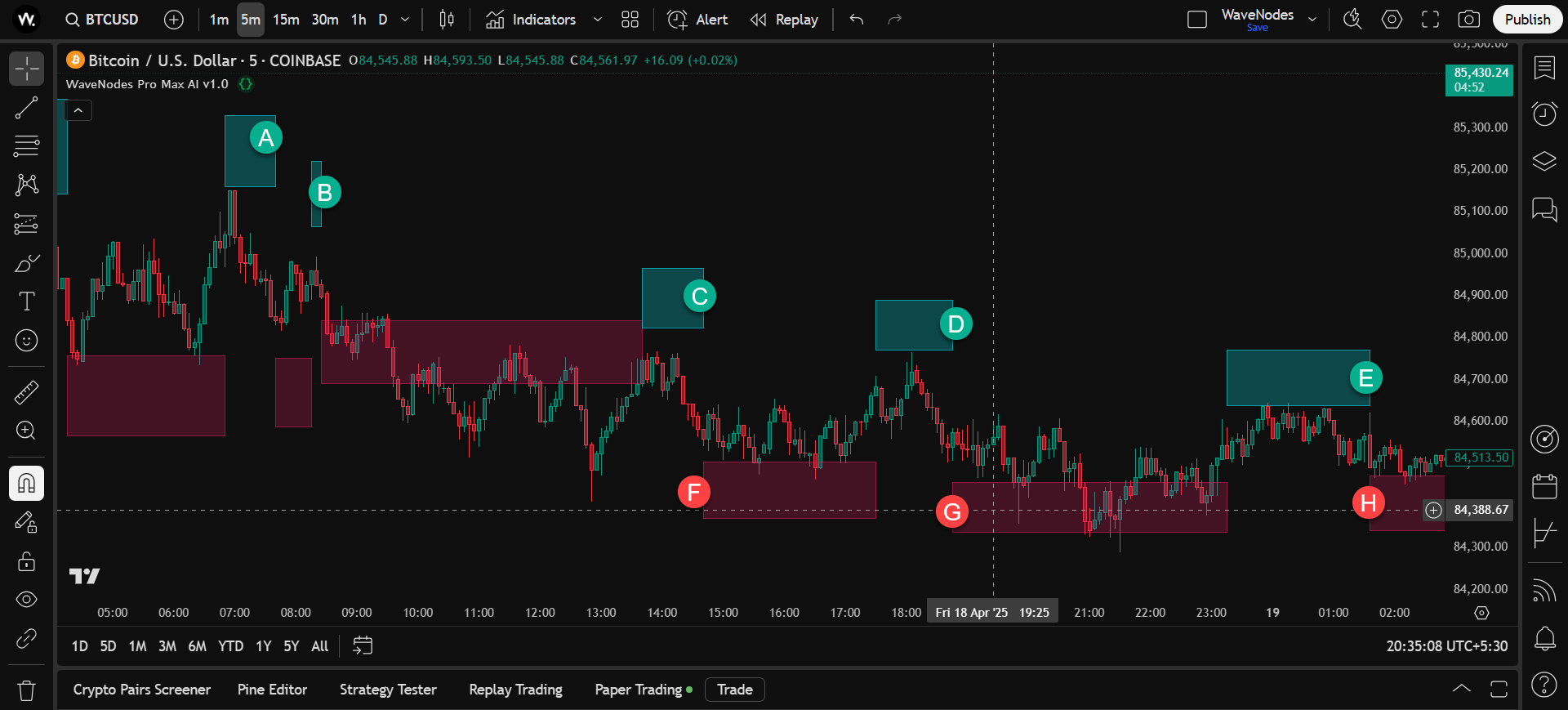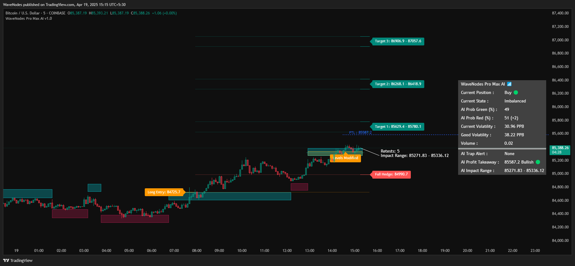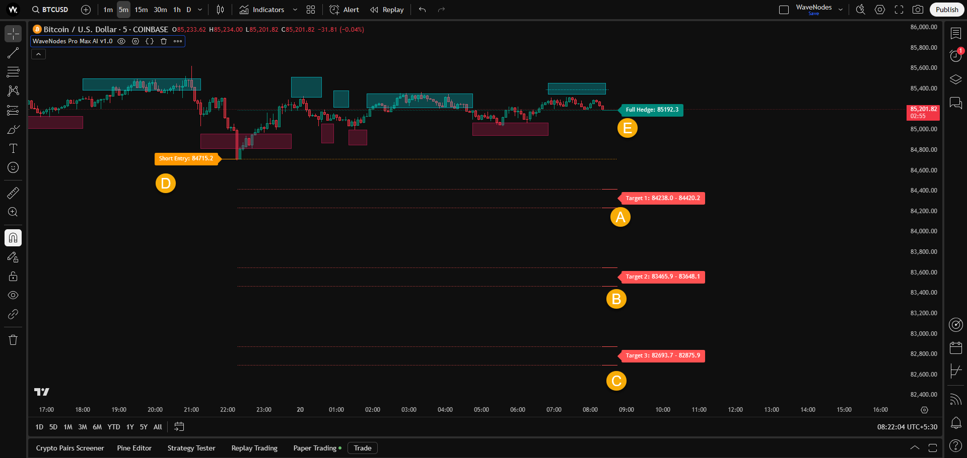 Bitcoin chart showing modified opportunity build up on long side on 5 min timeframe